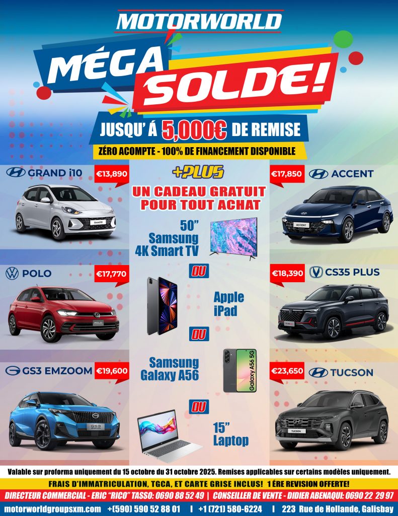 Spécialement pour vous, Saint-Martin ! Méga Solde chez Motorworld ! Rendez-vous à Galisbay pour des prix cassés sur vos modèles préférés ! Des offres exceptionnelles avec jusqu’à 5000€ de remise sur les plus grandes marques : Changan, Hyundai, Volkswagen et GAC ! Nos deals de folie : - Hyundai Grand i10 — 13 890€ -...